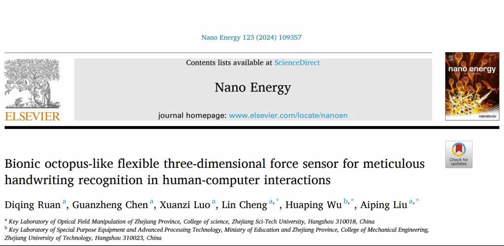 2024215日,国际著名期刊Nano Energy在线发表了题为Bionic octopus-like flexible three-dimensional force sensor for meticulous handwriting recognition in human-computer interactions研究论文。该研究成果由浙江理工大学理学院刘爱萍教授团队领衔完成,论文报告了该团队在柔性传感器设计制备及人机交互的应用成果。理学院2021级硕士研究生阮迪清为第一作者,浙江理工大学理学院程琳、刘爱萍教授,浙江工业大学吴化平教授为共同通讯作者,浙江理工大学为第一完成单位该研究成果得到国家自然科学基金项目,浙江省 "万人计划 "青年拔尖人才项目浙江省自然科学基金项目的支持。