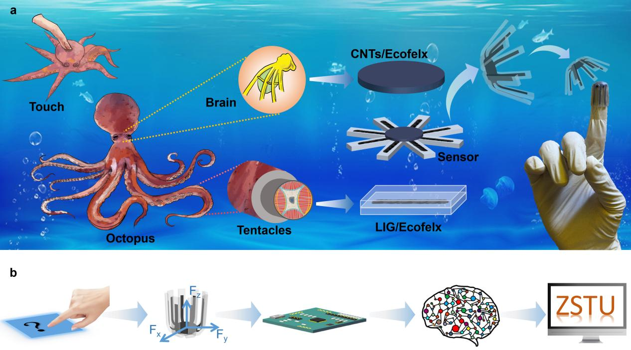 柔性触觉传感器具有灵活性高、多功能集成、佩戴舒适等优点,在智能传感和人机交互领域具有巨大的应用潜力。然而,高灵敏度采集触觉信息、解耦复杂触觉信号,以及提高柔性触觉传感器在人机界面中的兼容性仍然是当前研究面临的严峻挑战。浙江理工大学刘爱萍教授课题组从章鱼的身体结构中汲取灵感,开发了一种仿生章鱼柔性三维力传感器CNT/Ecoflex导电弹性体作为仿生章鱼传感器的身体用于捕获三维空间力的法向分量,同时Ecoflex转印的激光诱导的石墨烯(LIG/Ecoflex)作为仿生章鱼传感器的触觉手腕用于辨别空间力切向分量的大小和方向。仿生章鱼三维力传感器表现出优异触觉传感和可穿戴特性,包括快速高效的响应、周期稳定性和灵活的皮肤贴合性。独特的仿生章鱼结构设计赋予了传感器灵敏的空间力感知能力,通过使用多层感知器(MLP)进行映射和校准,仿生章鱼传感器实现了空间三维力的精确解耦和输出。将仿生章鱼三维力传感器包络在指尖上进行书写,传感器成功提取了佩戴者的信息,展示了其在智能可穿戴、手写识别和交互式人机界面等领域的巨大潜力。