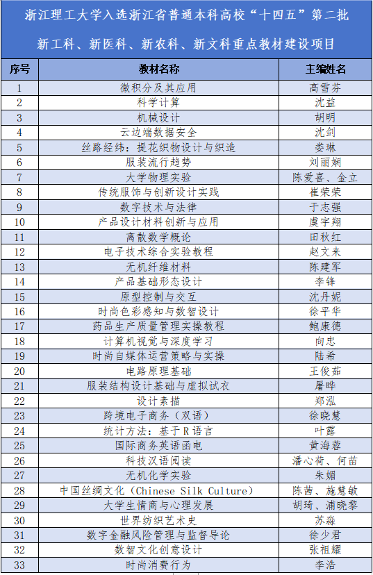 近日,浙江省高等教育学会公布了浙江省普通本科高校“十四五”第二批新工科、新医科、新农科、新文科重点教材建设项目评审结果,我校33部教材入选重点教材建设名单。