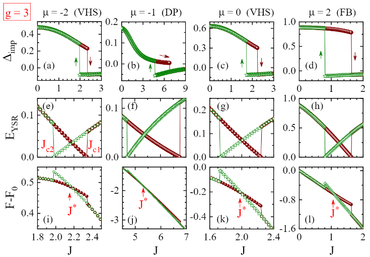 图 2杂质处的超导对势值(a-d)、YSR态能量(e-h)、自由能(i-l)随磁-自旋耦合常数J的变化关系。红色圆点和蓝色星标的曲线分别代表J上升分支和J下降分支。Jc1和 Jc2为零能YSR态的上临界和下临界耦合值。J∗为一阶相变点,与自由能最小的稳定YSR态能量相对应。