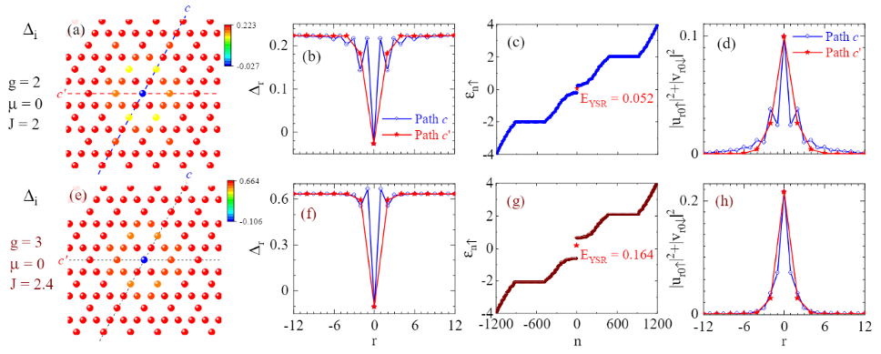 图1 零温和零化学势下的自洽数值计算结果,参数为(g, J) = (2, 3)和(3, 2.4):(a, e) 磁性杂质附近超导对势的等高线图;(b, f) 杂质附近沿c和c′方向的对势空间分布;(c, g) 准粒子能谱与YSR态能量;(d, h) YSR 态的波函数空间分布。