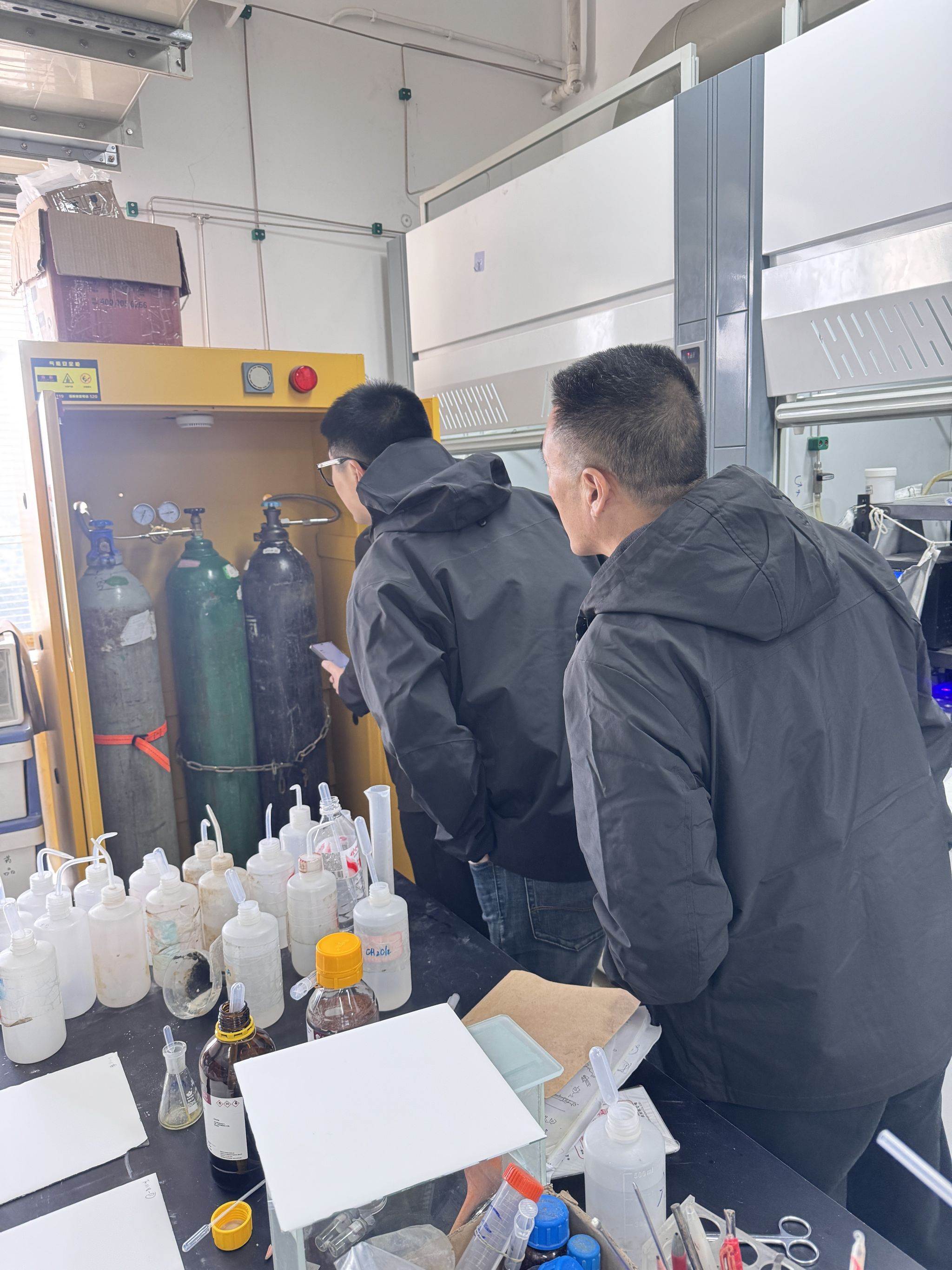 在为期两天的检查中,第三方检测专家秉持 “专业、严谨、细致”的原则,通过实地查看、现场问询等方式,对实验室气体钢瓶的储存条件、固定方式、标识标签、减压阀及管路密封性等进行逐一排查,重点检查了有毒有害气体的是否配置报警装置及其灵敏度、易燃易爆气体的防爆设施配置、腐蚀性气体的防护措施落实情况。针对检查中发现的安全隐患,现场与各学院管理人员沟通反馈。